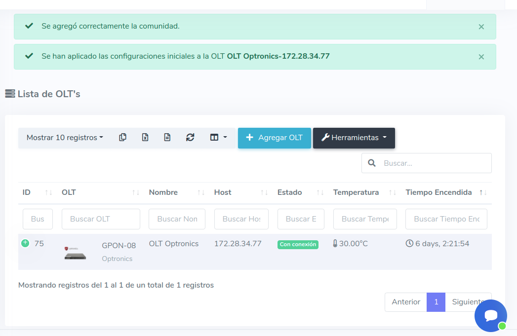 Al aplicar esta acción AdminOLT creará las comunidades que registró al momento de agregar la OLT en el sistema, de igual manera se creará un DBA que se usará al momento de autorizar una ONT.