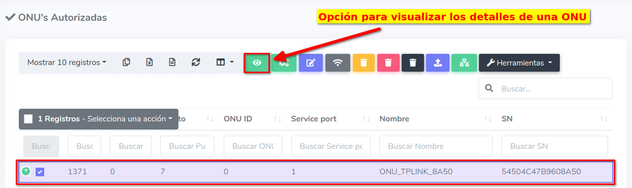 1Para ver los dispositivos que aún no han sido autorizados, debemos dirigirnos a la sección ONU > Sin Autorizar y seleccionar alguna ONU disponible.