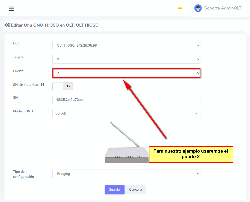 Es importante que coloque la ONU en el puerto correcto ,ya que si no se hace, la ONU seguirá saliendo como Offline