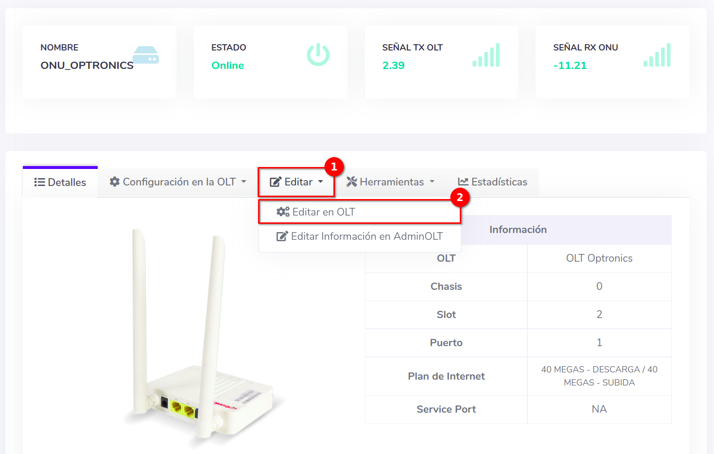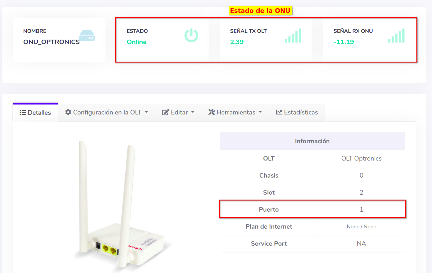En este ejemplo la ONU se encuentra en en el Puerto 1; lo pasaremos al Puerto 7. Antes de editar verifique que la ONU cuente con servicio