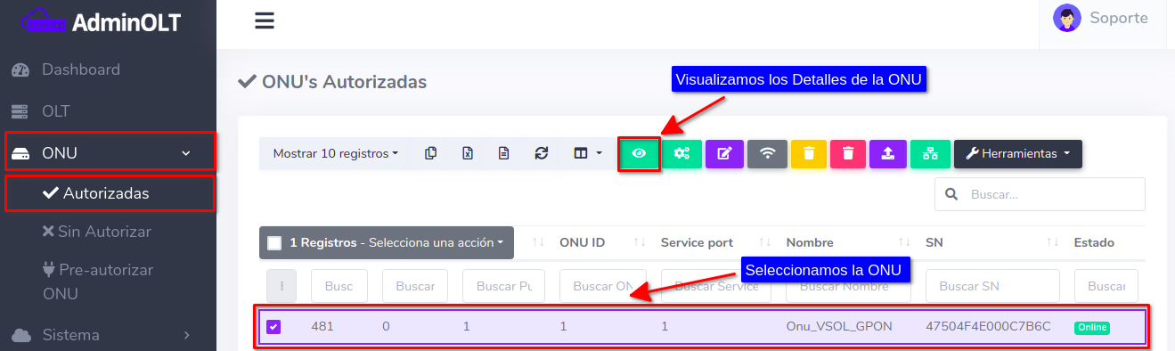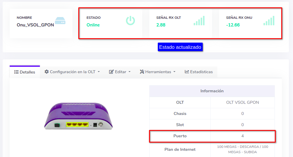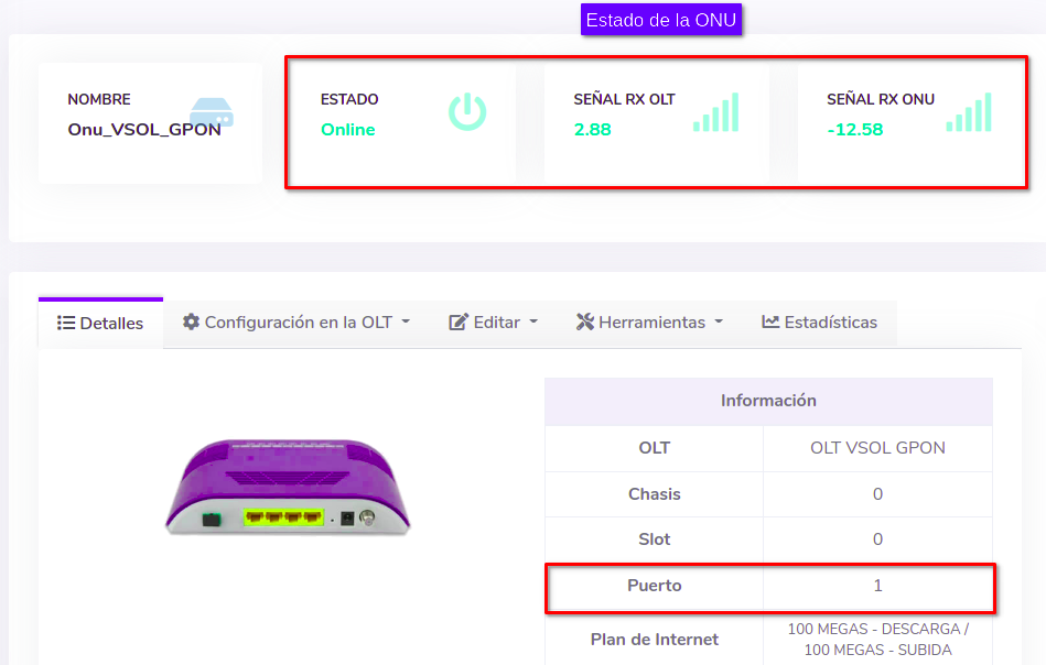 Es importante que coloque la ONU en el puerto correcto ya que si no se hace, la ONU seguirá saliendo como Offline