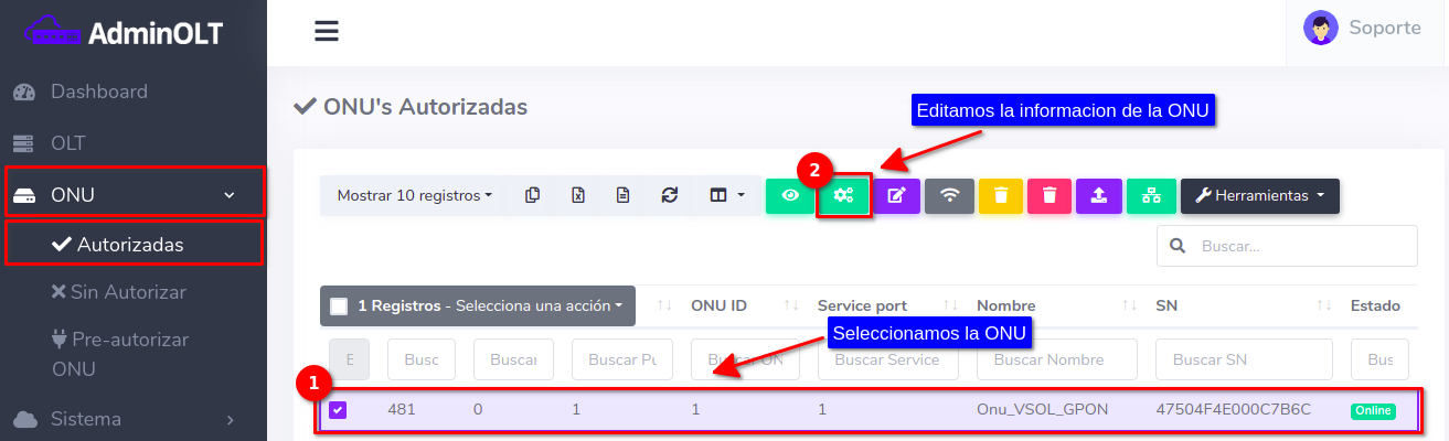 Dar click en el texto Editar en OLT que se encuentra en el botón con la leyenda Editar.