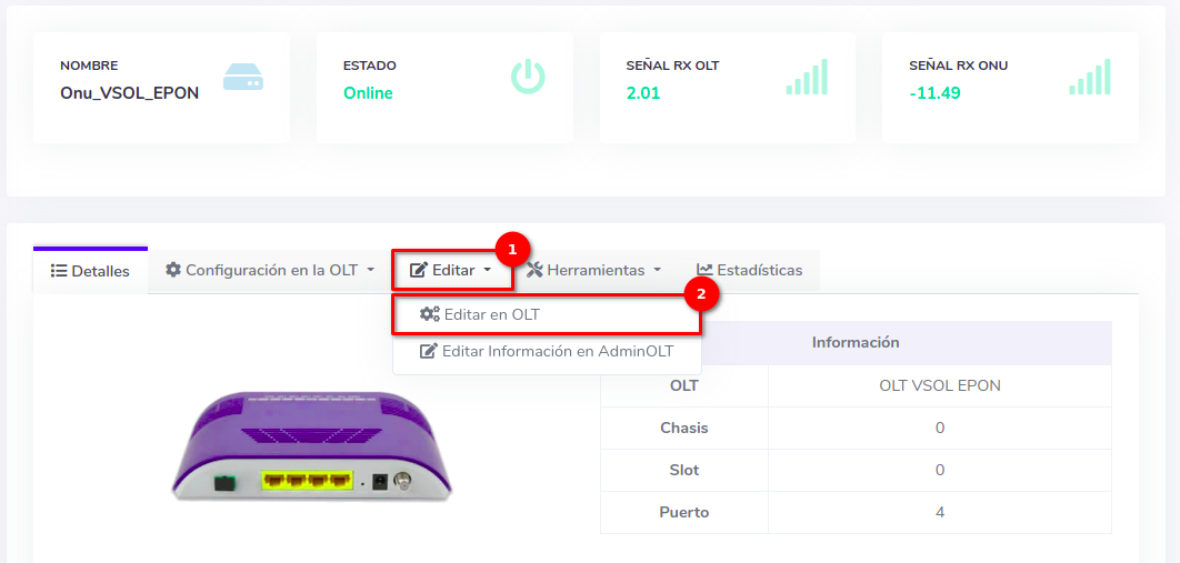 Dar click en el texto Editar en OLT que se encuentra en el botón con la leyenda Editar.