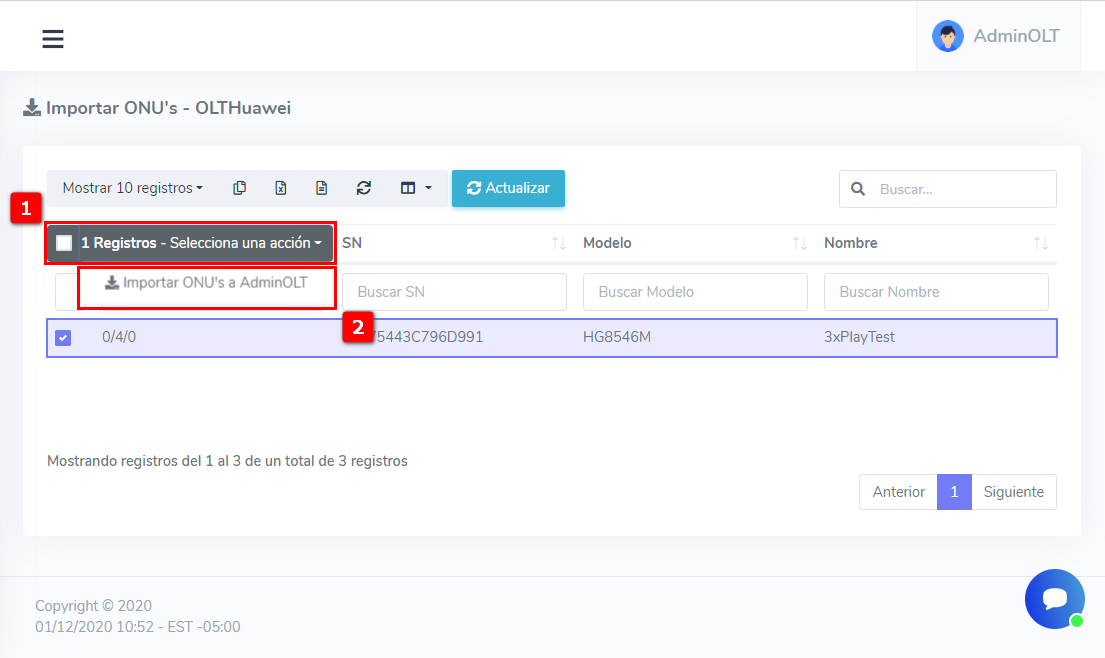 3Una vez que hayamos seleccionado los equipos que queramos cargar al sistema solo toca darle en la opción de Selecciona una acción y en Importar ONU’s a AdminOLT lo que empezara a cargar dicho equipo.