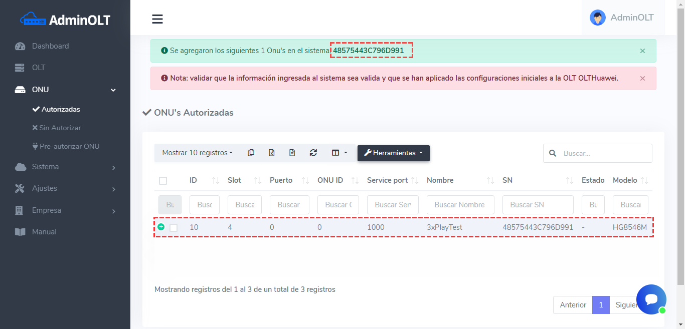 4Una vez que el equipo se haya cargado al sistema se nos mandara a la lista de ONU’s Autorizadas y se nos mostrara el aviso de que el equipo se ha cargado correctamente.