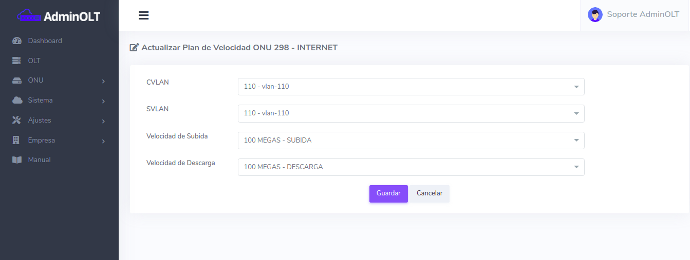 Una vez autorizada la ONU podrán modificar sus planes de velocidad y vlans asociados a los servicios desde la Lista de planes de velocidad.