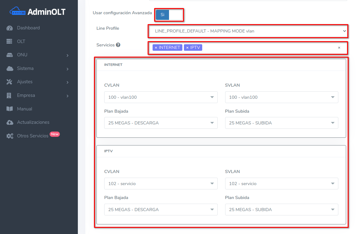- AdminOLT crea un perfil de línea (Line Profile) con base a los datos y servicios seleccionados.
