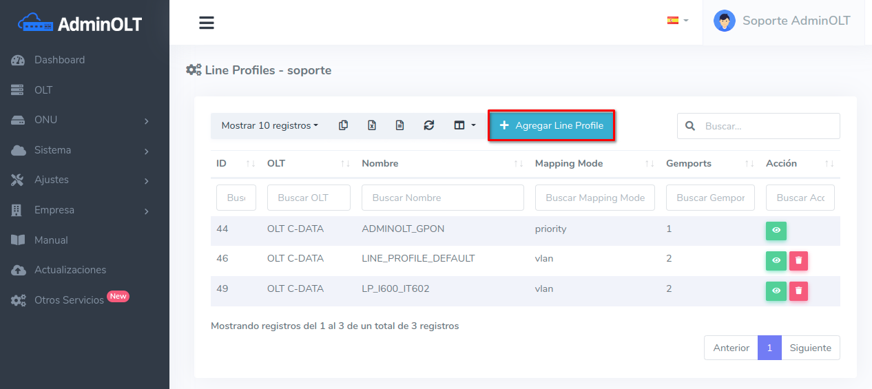 El Line Profile creado automáticamente podrá ser encontrado en la lista de Line Profiles pertenecientes a la OLT.