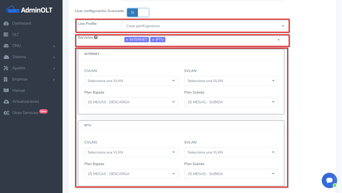 - Line Profile: Lista de Line Profiles creados en AdminOLT pertenecientes a la OLT seleccionada. Adicional una opción "Crear perfil genérico" que permite crear una configuración personalizada Line Profile, de acuerdo a los servicios y CVLAN's seleccionados.