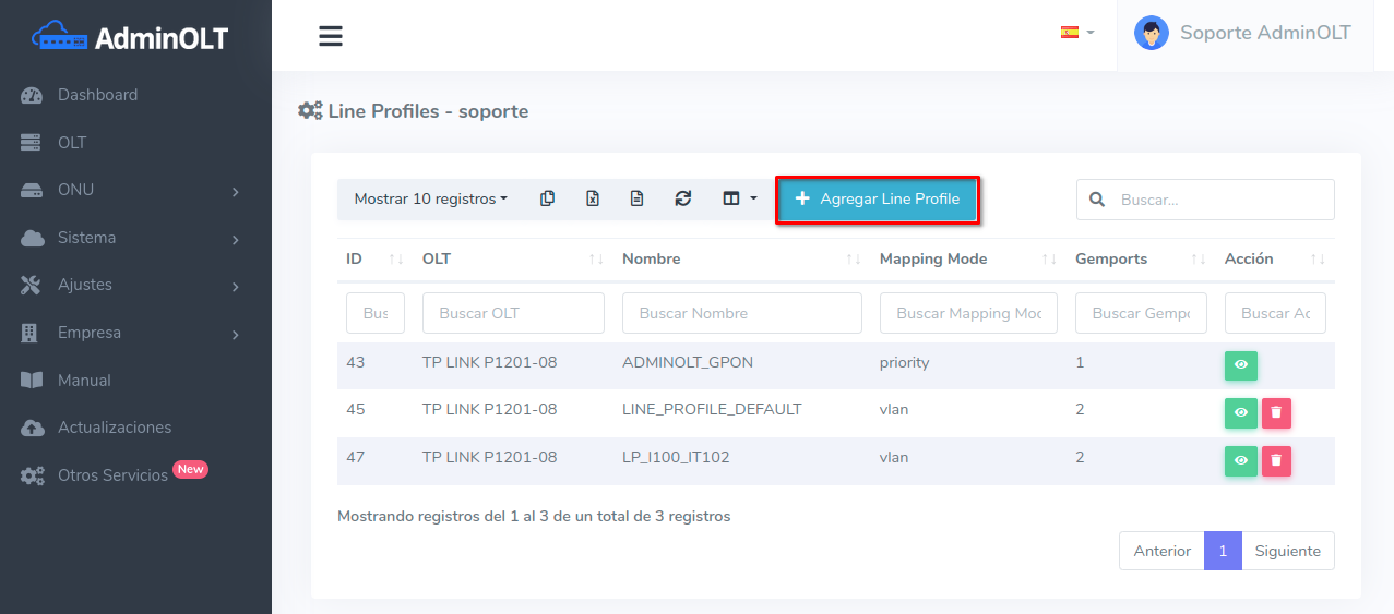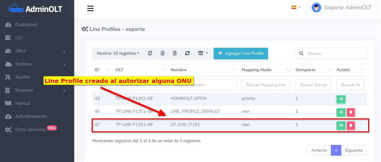 El Line Profile creado automáticamente podrá ser encontrado en la lista de Line Profiles pertenecientes a la OLT.