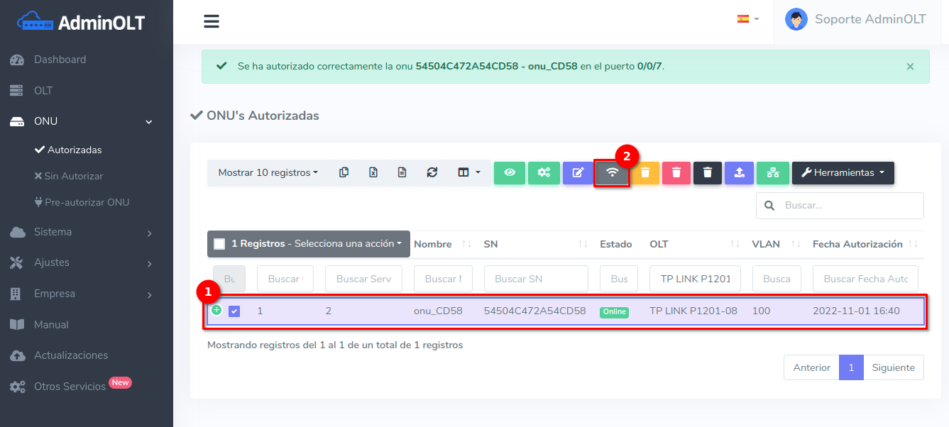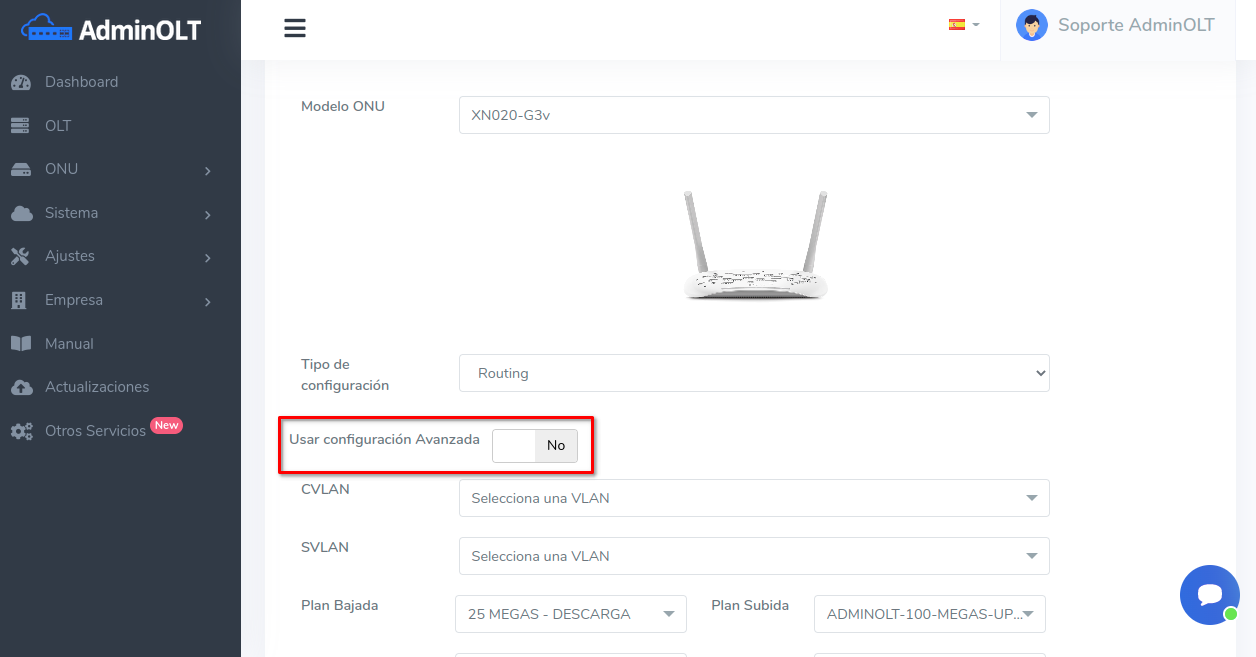 Una vez autorizada la ONU podrán modificar sus planes de velocidad y vlans asociados a los servicios desde la Lista de planes de velocidad.