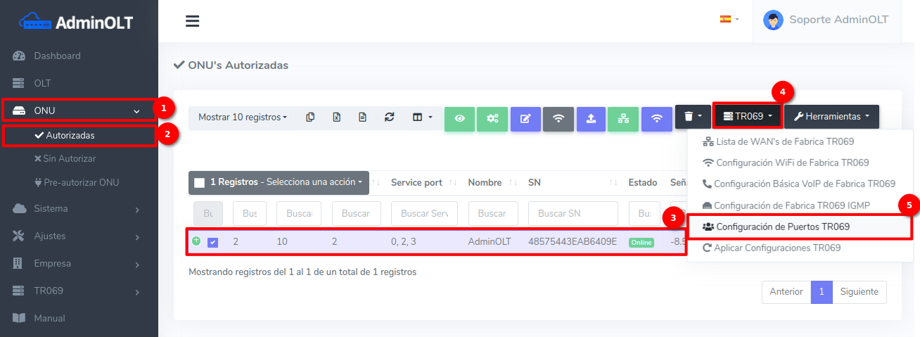 1Para poder agregar la configuración de puertos TR069, debemos dirigirnos a la sección ONU > Autorizadas. Seleccionamos la ONU a la que vamos a agregar la WAN IP, damos Clic en TR069 > Configuración de Puertos TR069.