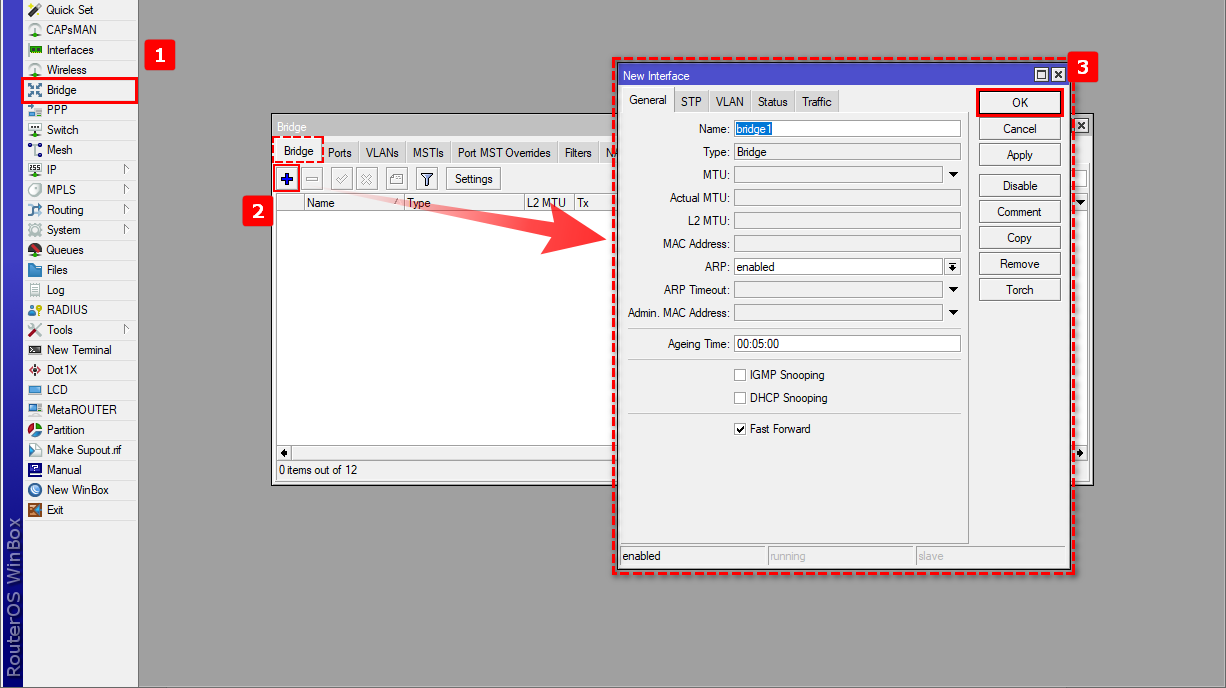 1 Nos dirigimos al apartado de Bridge en el menú de nuestro RouterBoard para crear la interfaz bridge1 y así poder agrupar los puertos que estarán trabajando en la red de la OLT.