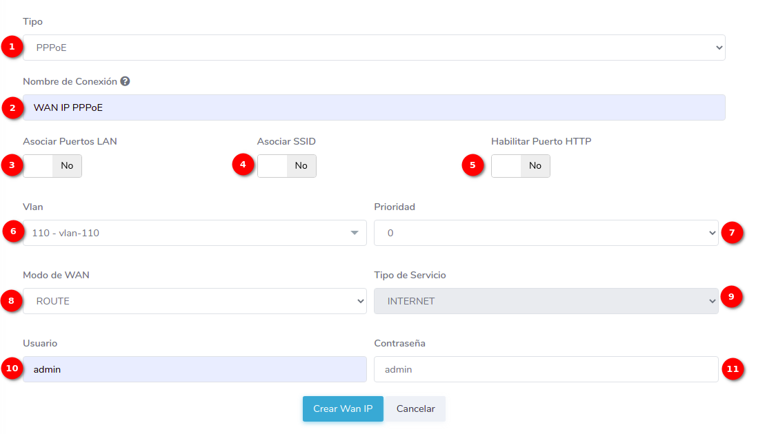 - 1.-Tipo: En AdminOLT se pueden crear configuraciones WAN IP de tipo STATIC, DHCP, PPPoE. En este ejemplo crearemos una WAN IP PPPoE.