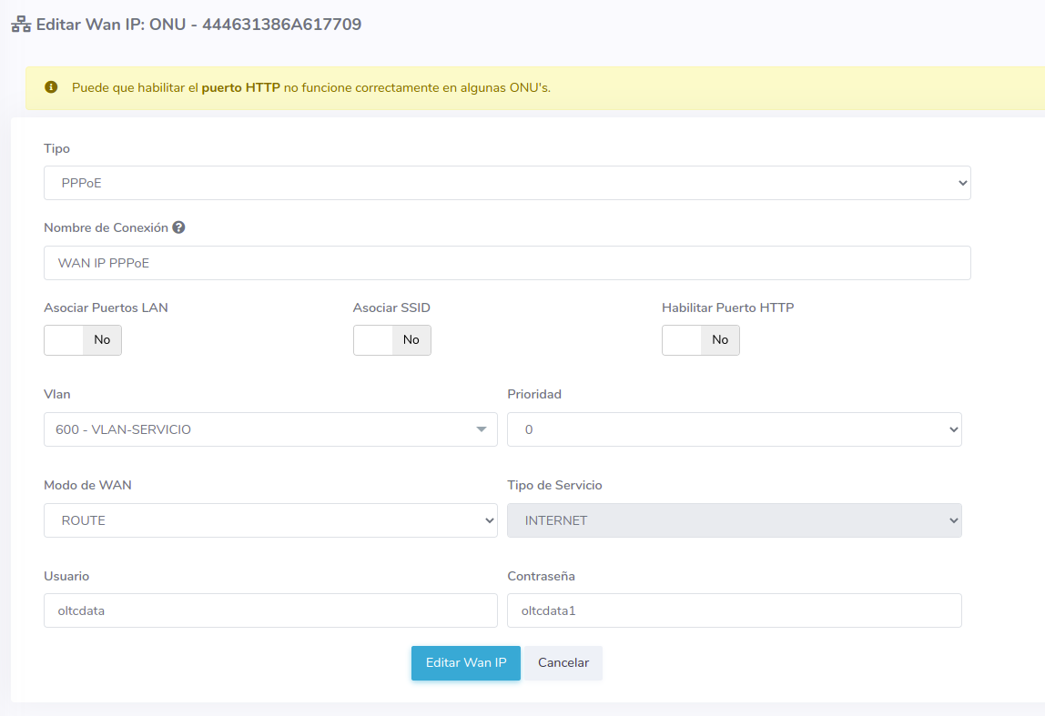 - 1.-Tipo: En AdminOLT se pueden crear configuraciones WAN IP de tipo STATIC, DHCP, PPPoE. En este ejemplo crearemos una WAN IP PPPoE.
