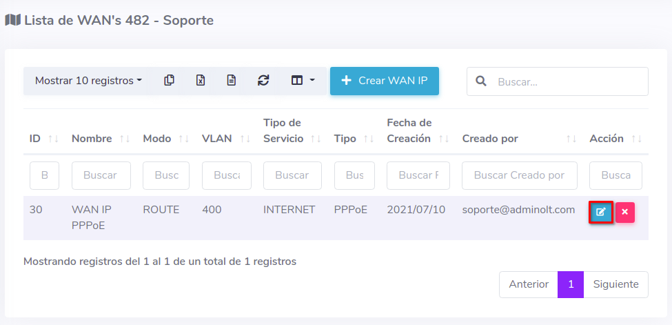 2Seleccione la opción Crear WAN IP y complete el formulario, con este proceso podrá autorizar y crear una WAN IP a una ONU al mismo tiempo.