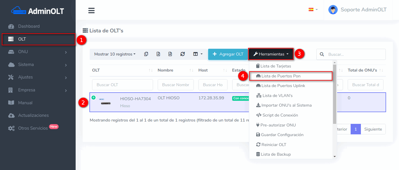 1 Ir a Lista de Puertos PON de nuestra OLT