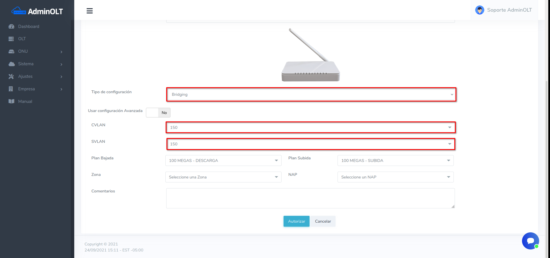 2Configure la Onu preferentemente en modo bridging y colocar alguna cvlan y una svlan