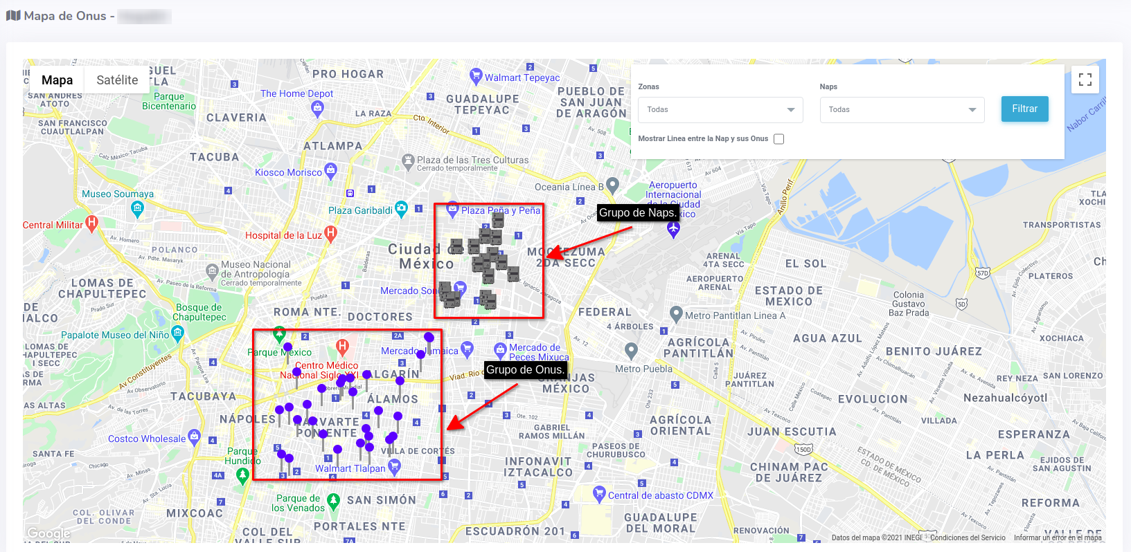 - Naps: Si necesita mostrar las Onus que pertenezcan a la Nap filtrada. (También mostrara la Nap en el mapa.)