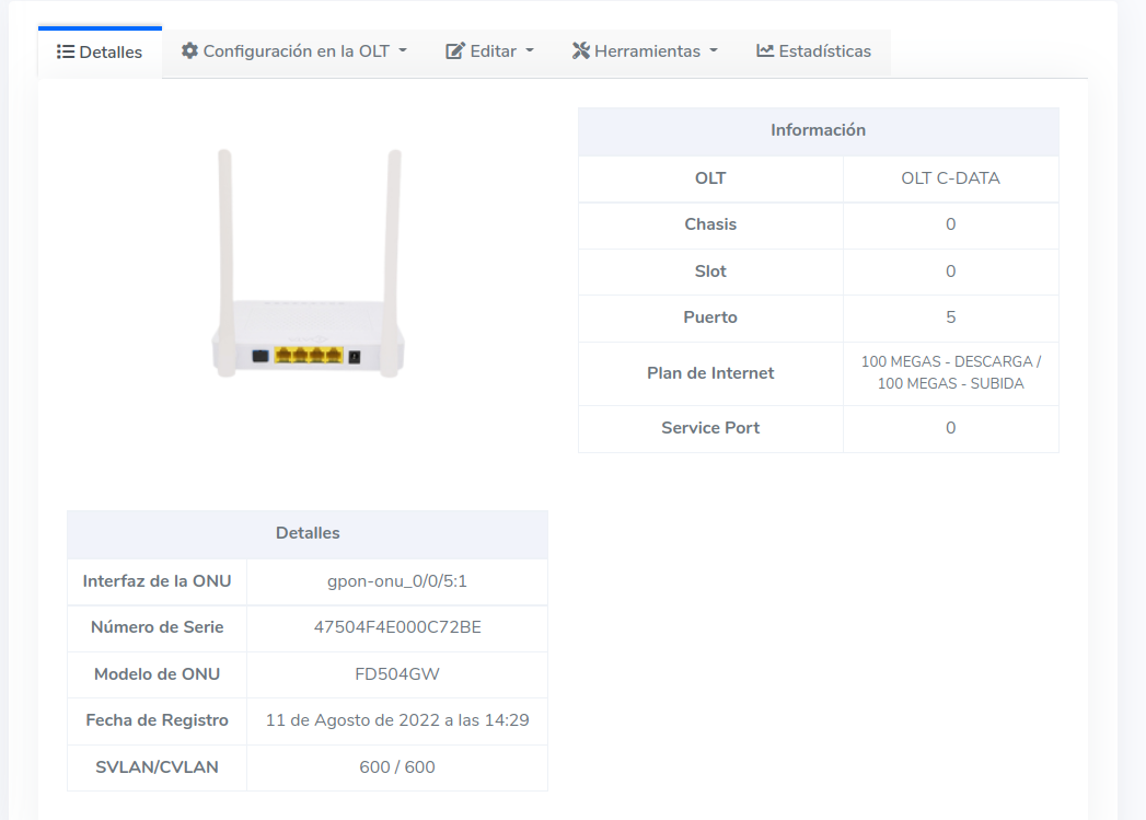 Es necesario que como primer paso sea seleccionar la OLT donde se realizara la acción. Al momento de seleccionar alguna OLT, se autocompletarán algunos datos del formulario, por ejemplo Tarjetas, Puertos o VLAN.